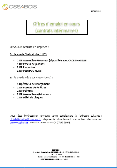 OSSABOIS : BILAN DES POSTES A POURVOIR UP42/UP63 – URGENT !